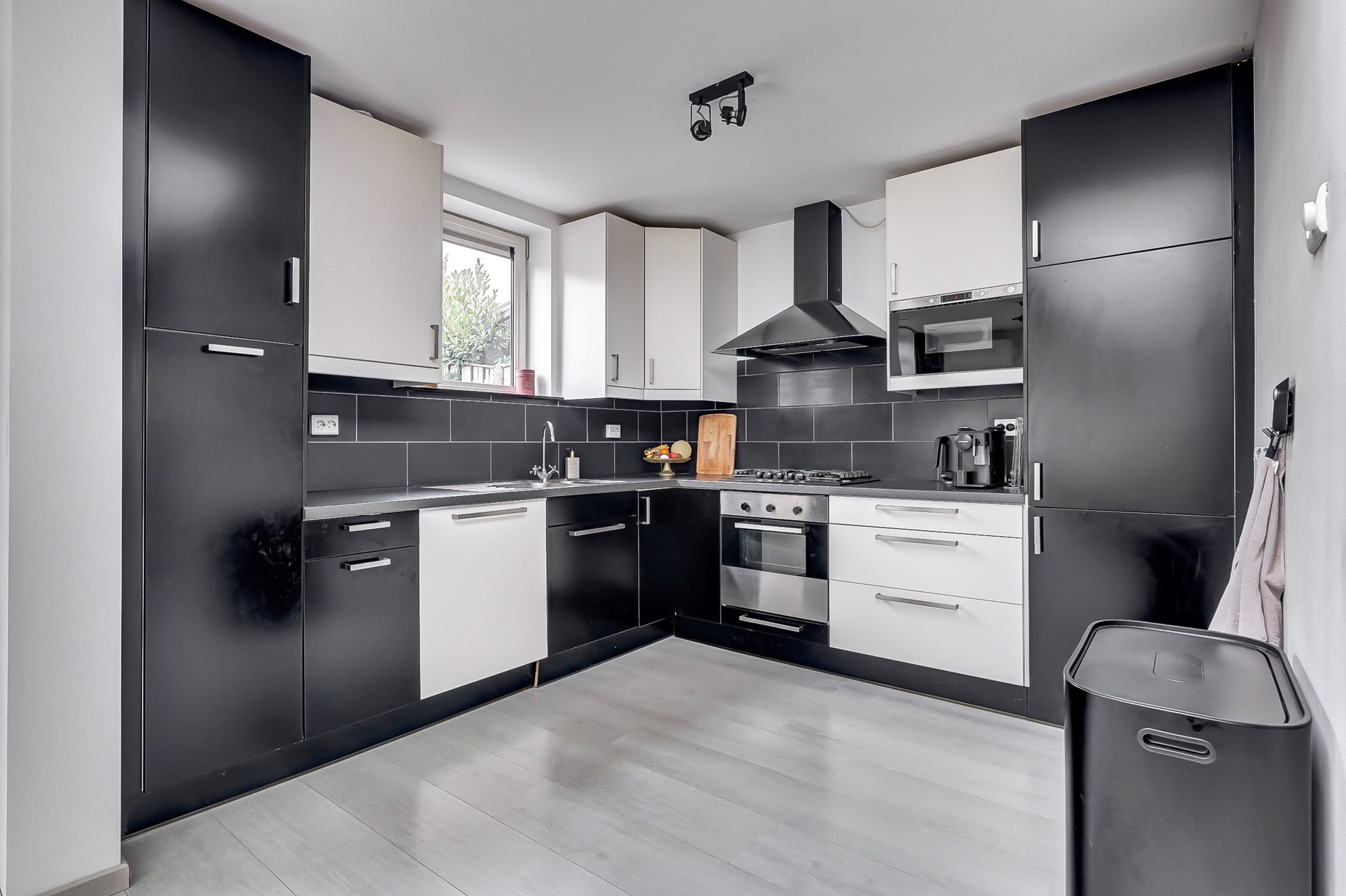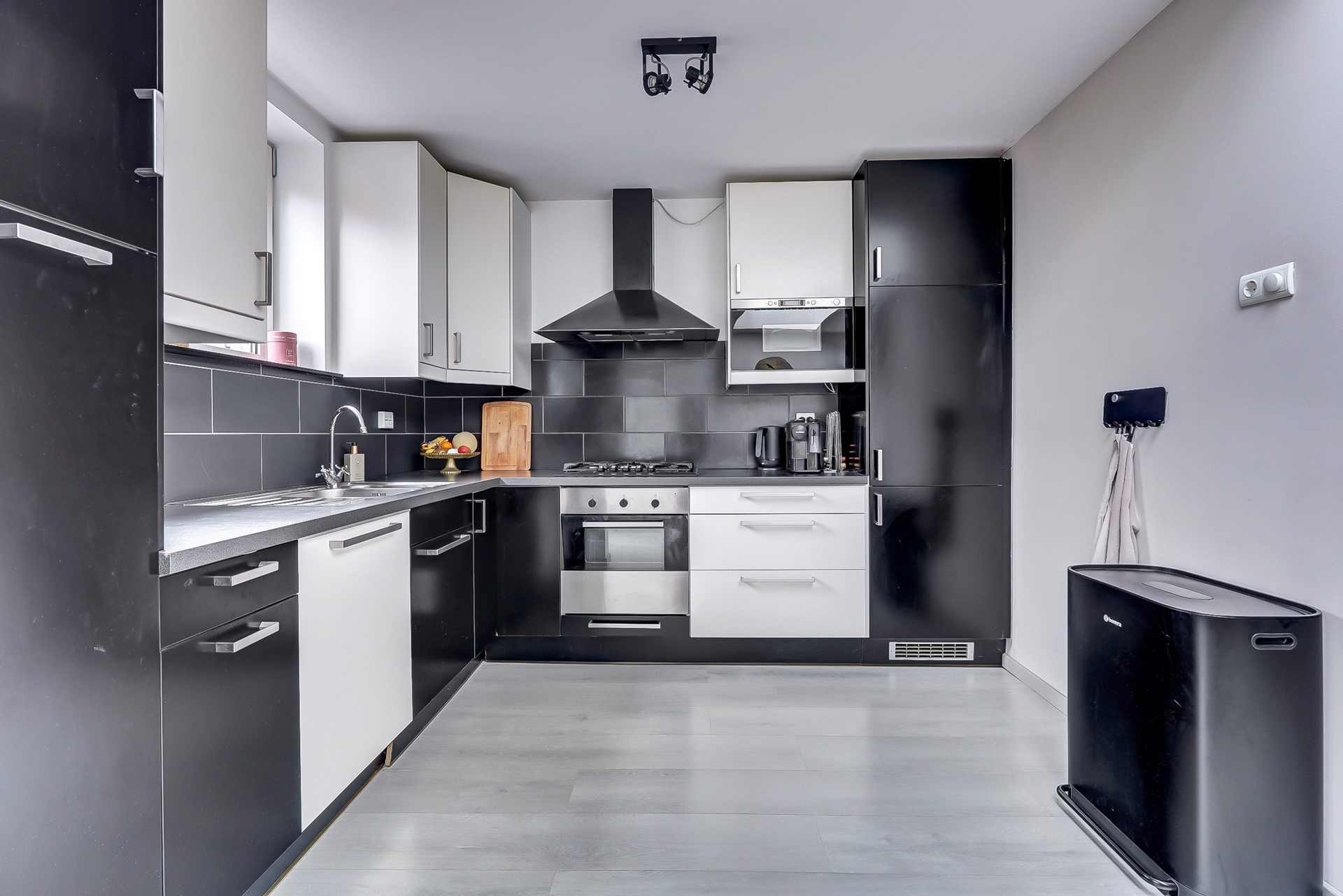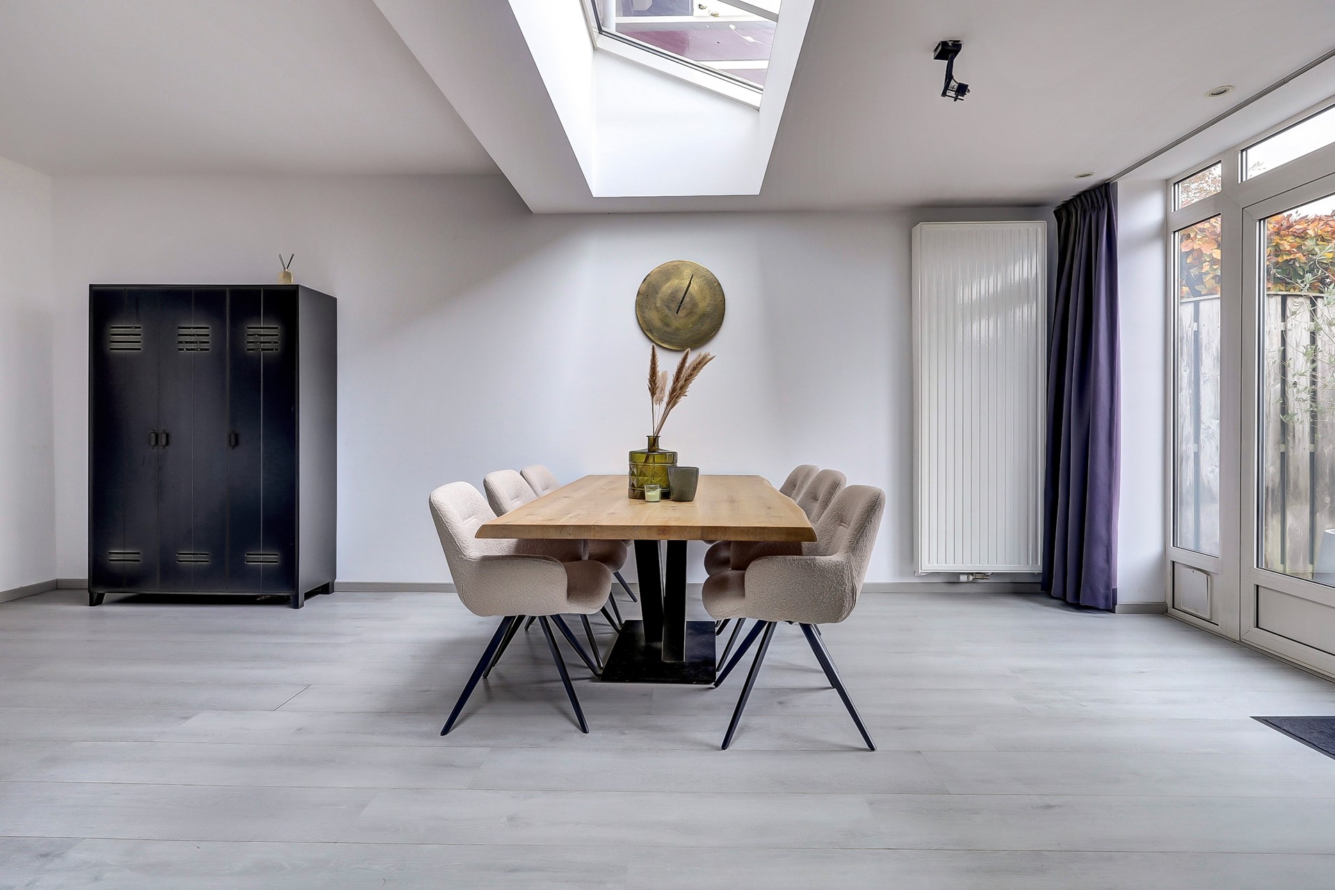 Via de groene voortuin bereik je de entree. De hal geeft toegang tot het toilet, de trapopgang en de woonkamer. De lichte en eigentijds afgewerkte woonkamer biedt een prettig gevoel van ruimte dankzij de open indeling en grote raampartijen. De moderne vloer en strakke wandafwerking zorgen voor een frisse, rustige basis. Aan de voorzijde bevindt zich een sfeervolle zithoek met voldoende plek voor een royale bank. Aan de achterzijde is de woning uitgebouwd, waardoor er een riante leefruimte is ontstaan. De grote lichtstraat zorgt voor een prachtige lichtinval en maakt deze ruimte ideaal als eetkamer. De openslaande deuren naar de tuin creëren een fijne verbinding tussen binnen en buiten. De open keuken ligt aan de tuinzijde en is uitgevoerd in een modern zwart-wit contrast. De keuken beschikt over diverse inbouwapparatuur, waaronder een oven, magnetron, kookplaat, afzuigkap, koelkast en vaatwasser. De opstelling biedt veel werk- en bergruimte.