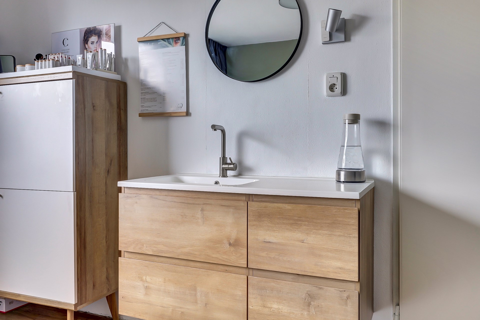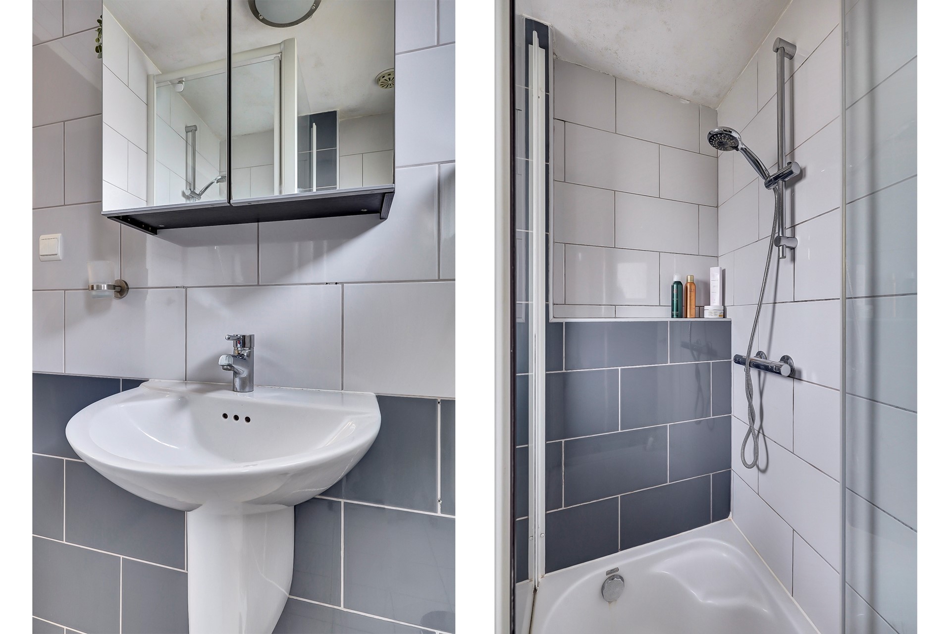 Op de eerste verdieping bevinden zich drie kamers, waaronder twee ruime slaapkamers. De kamers zijn groot genoeg voor een tweepersoonsbed en een kledingkast, en hebben een warme uitstraling dankzij de laminaatvloer en grote ramen. De badkamer is compact maar volledig uitgerust met een douchecabine, wastafelmeubel, radiator en toilet. De lichte betegeling en natuurlijke lichtinval zorgen voor een frisse uitstraling. Daarnaast is er een praktische inbouwkast aanwezig op de overloop van deze verdieping, ideaal voor het opbergen van handdoeken of de wasmand.