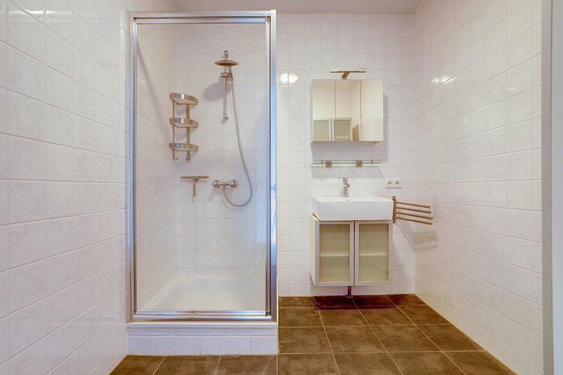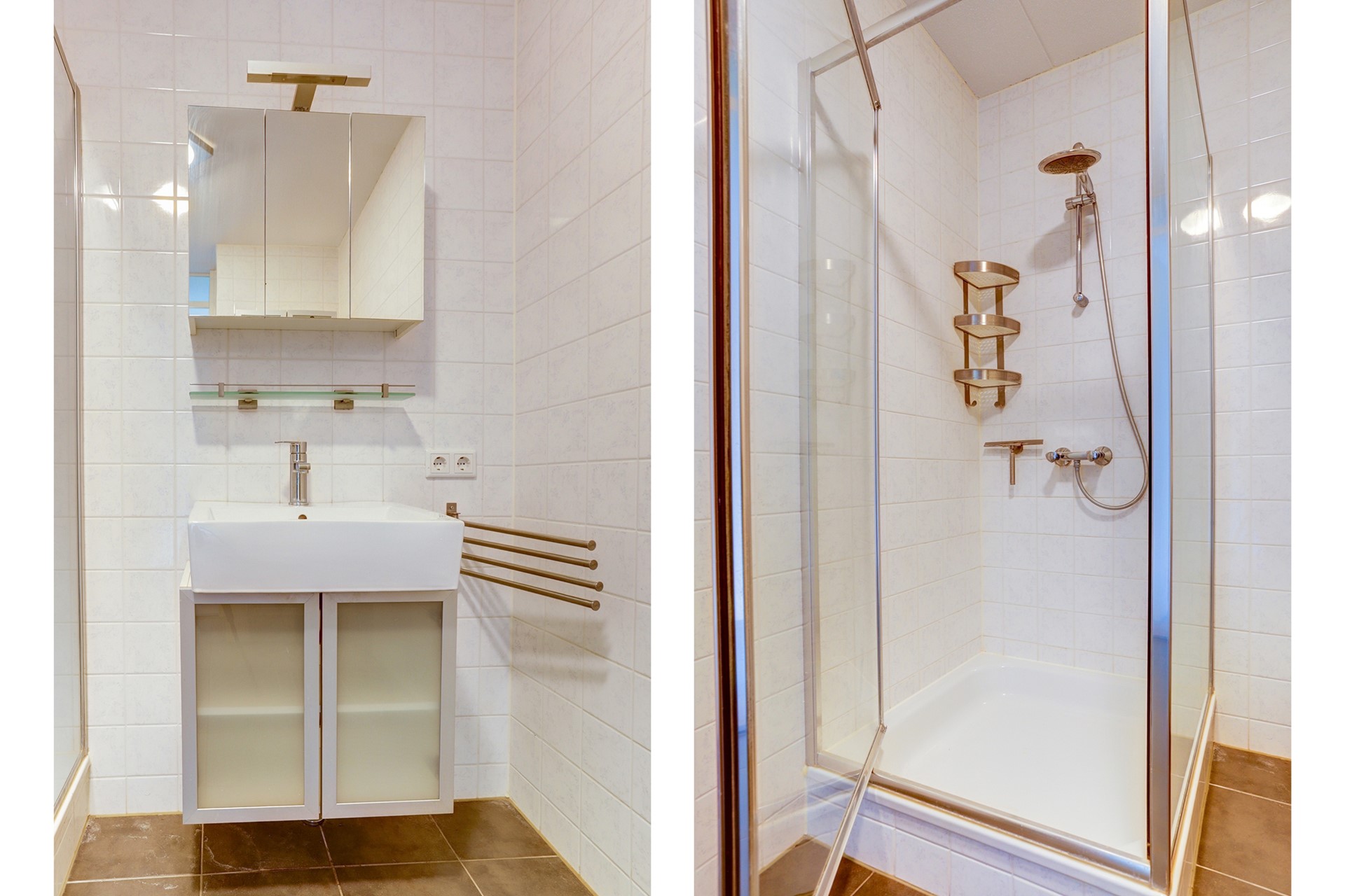 De badkamer is ruim (ca 6m2), afgewerkt met witte wandtegels en donkere vloertegels. Voorzien van een douchecabine en een wastafelmeubel met spiegelkast. Een frisse en praktische ruimte.