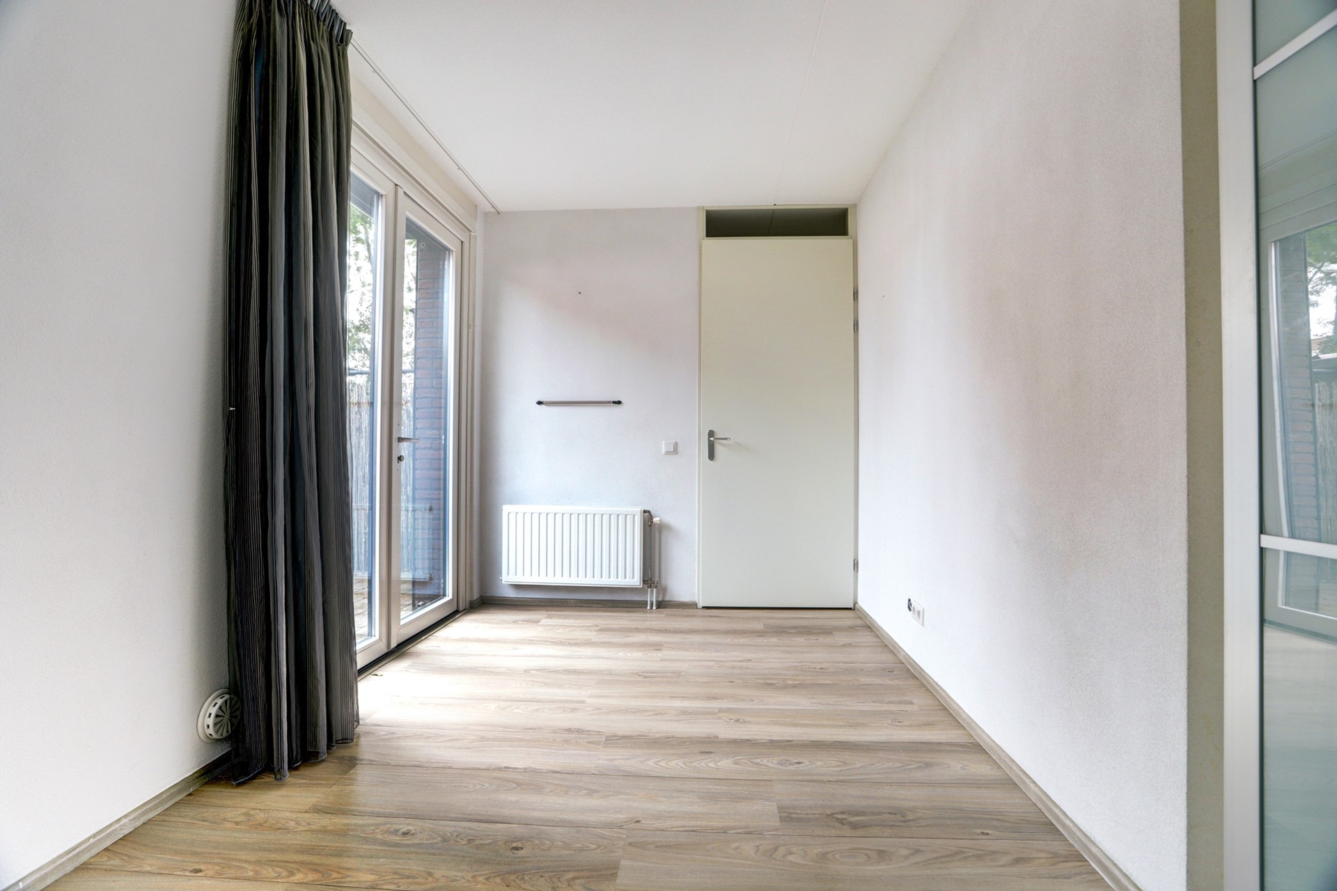 De slaapkamer van ca 12m2 ligt aan de achterzijde, rustig en al voorzien van een kledingkast. De openslaande deuren geven direct toegang tot de patio. Er is voldoende plek voor een tweepersoonsbed en de al aanwezige kledingkast.