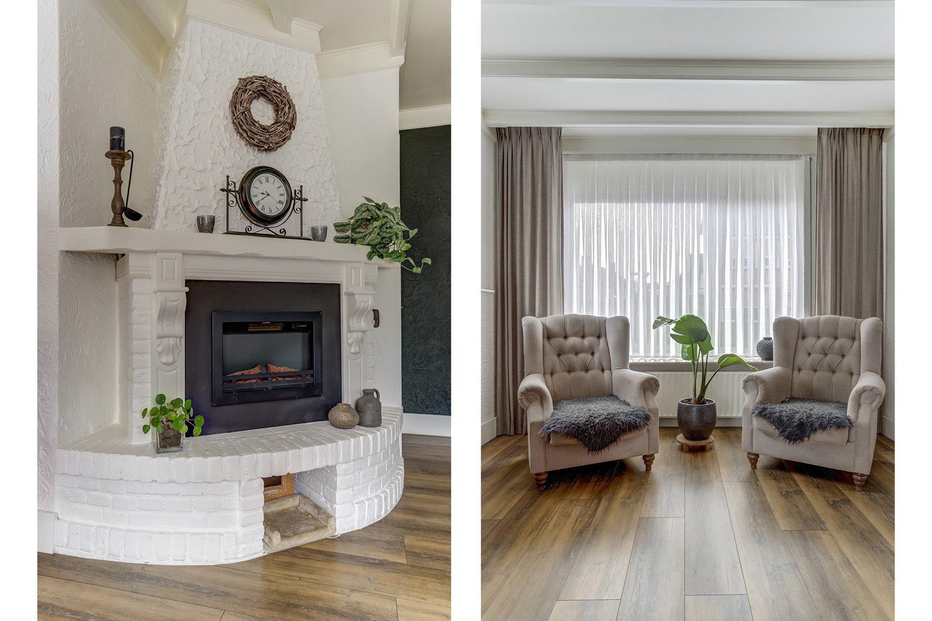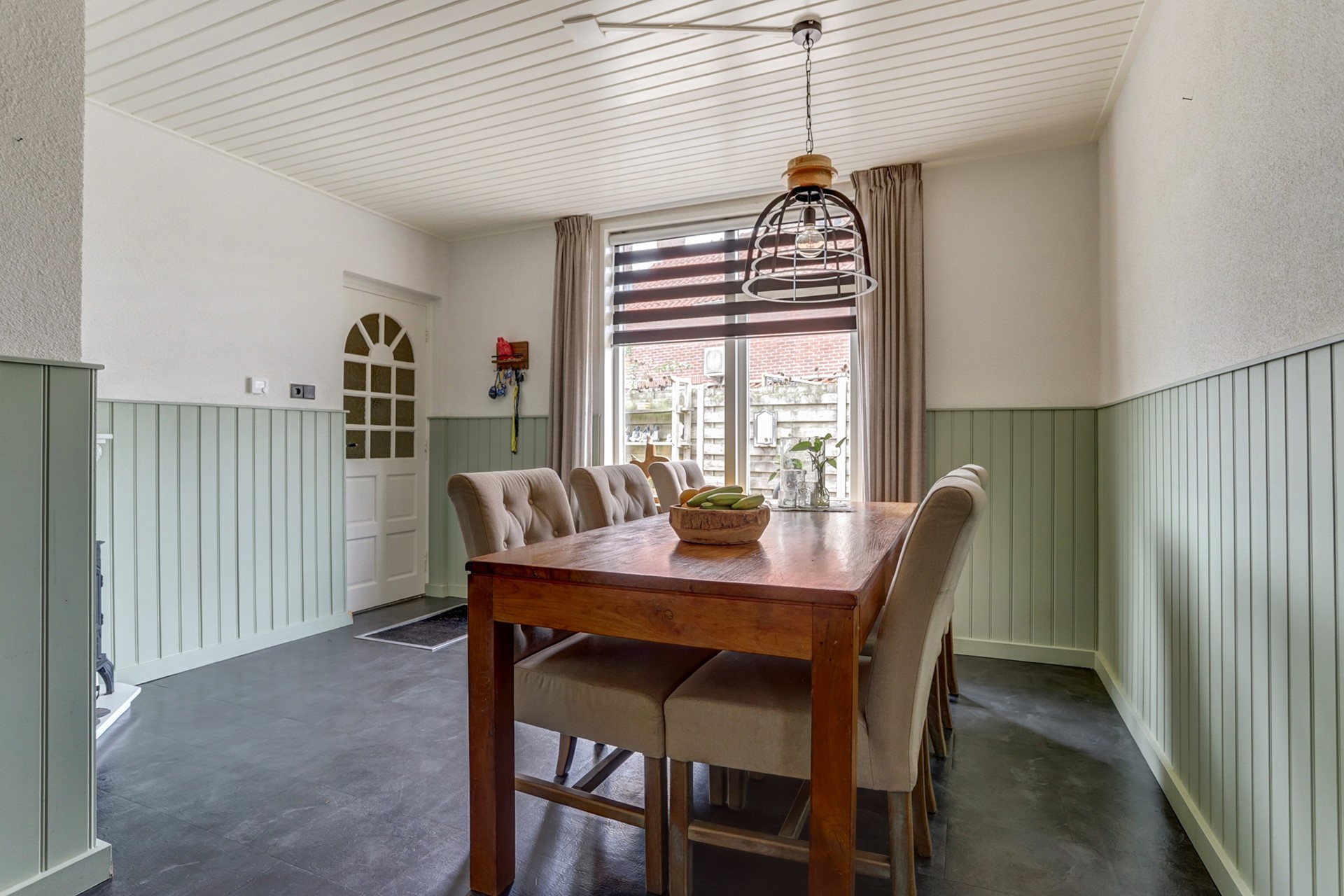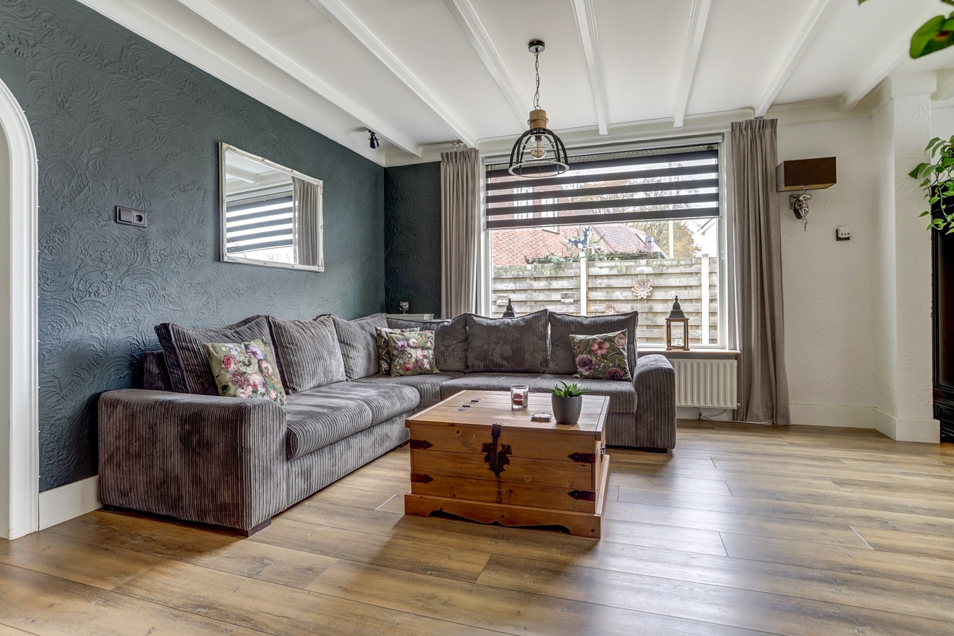 Aan de voorzijde ligt een sfeervolle woonkamer met grote ramen aan de straatzijde, een warme