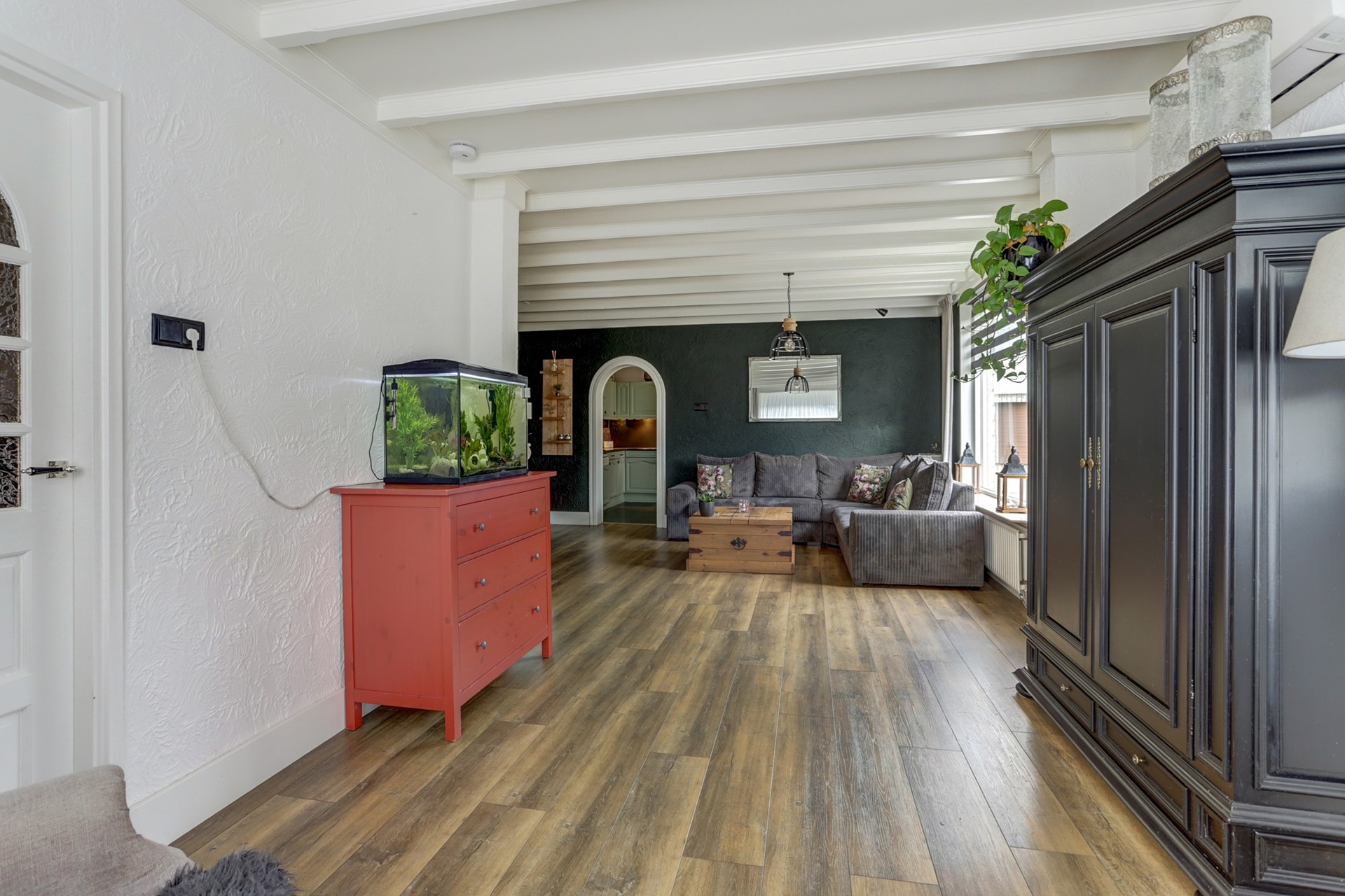 vloerafwerking en een karakteristieke schouw. De aangrenzende keuken heeft een landelijke uitstraling,