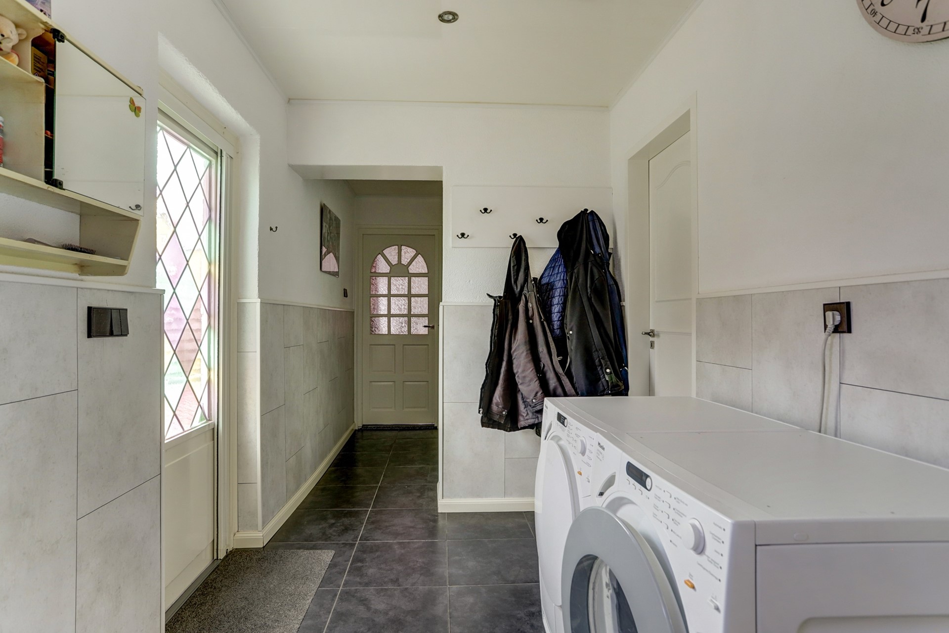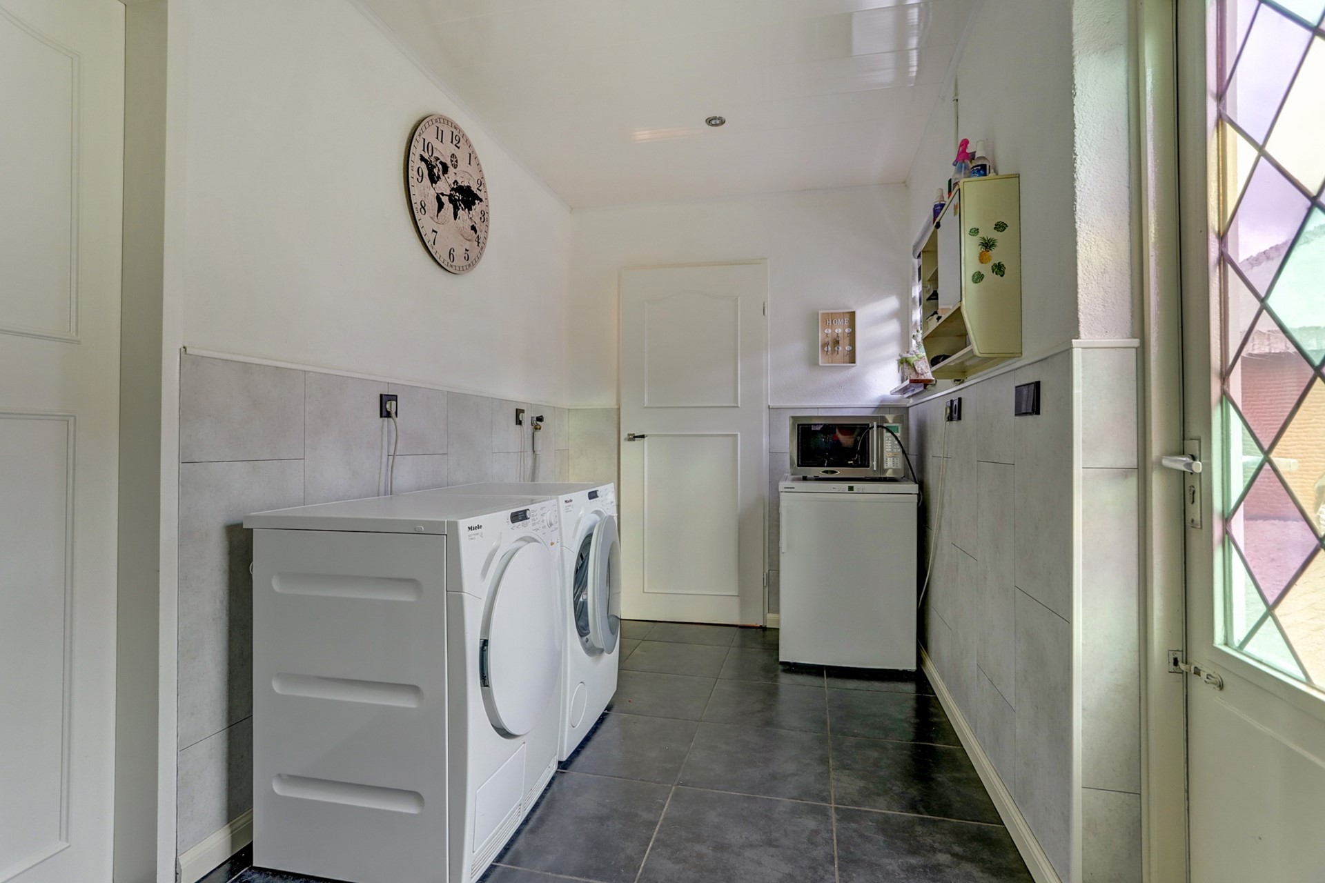 Verder naar achteren strekt zich een tweede, zeer ruime woonkamer uit. De vloertegels, de
