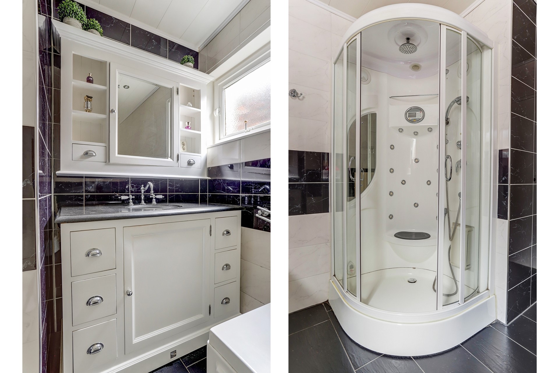 keuken bevindt zich de eerste badkamer, voorzien van een ligbad, aparte douche en stijlvol