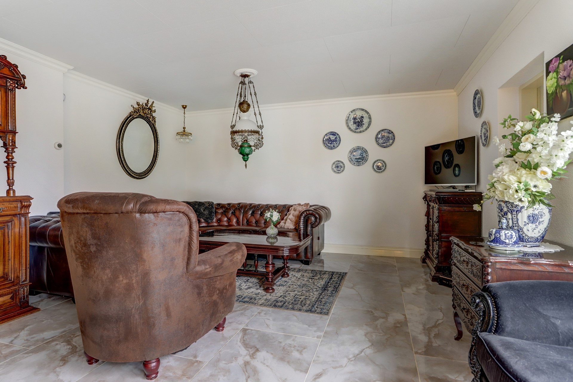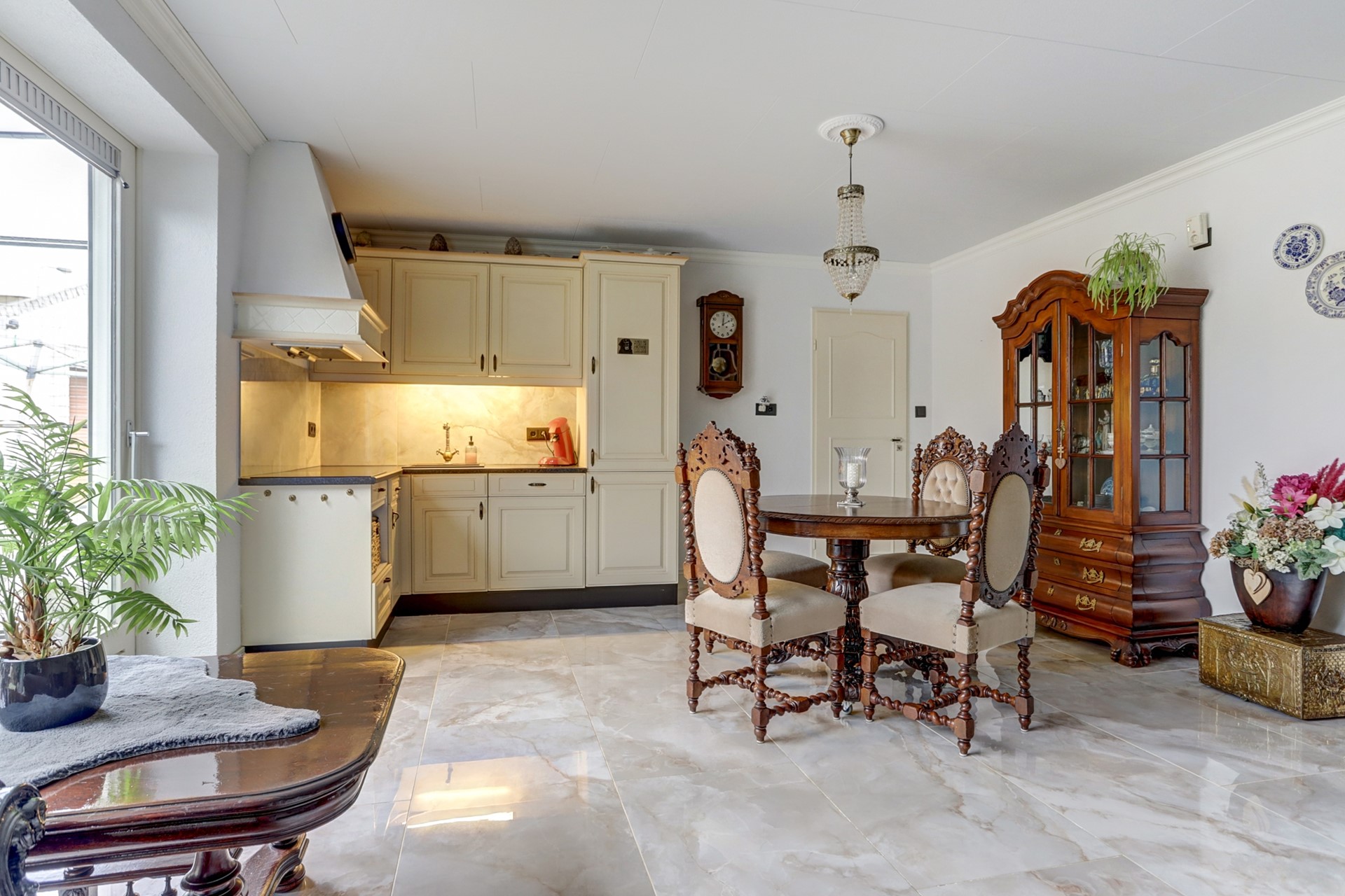 hoge raampartijen en de klassieke inrichting geven deze ruimte een luxueuze en royale ambiance. Hier is