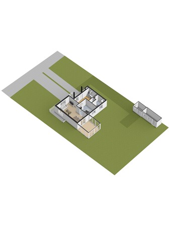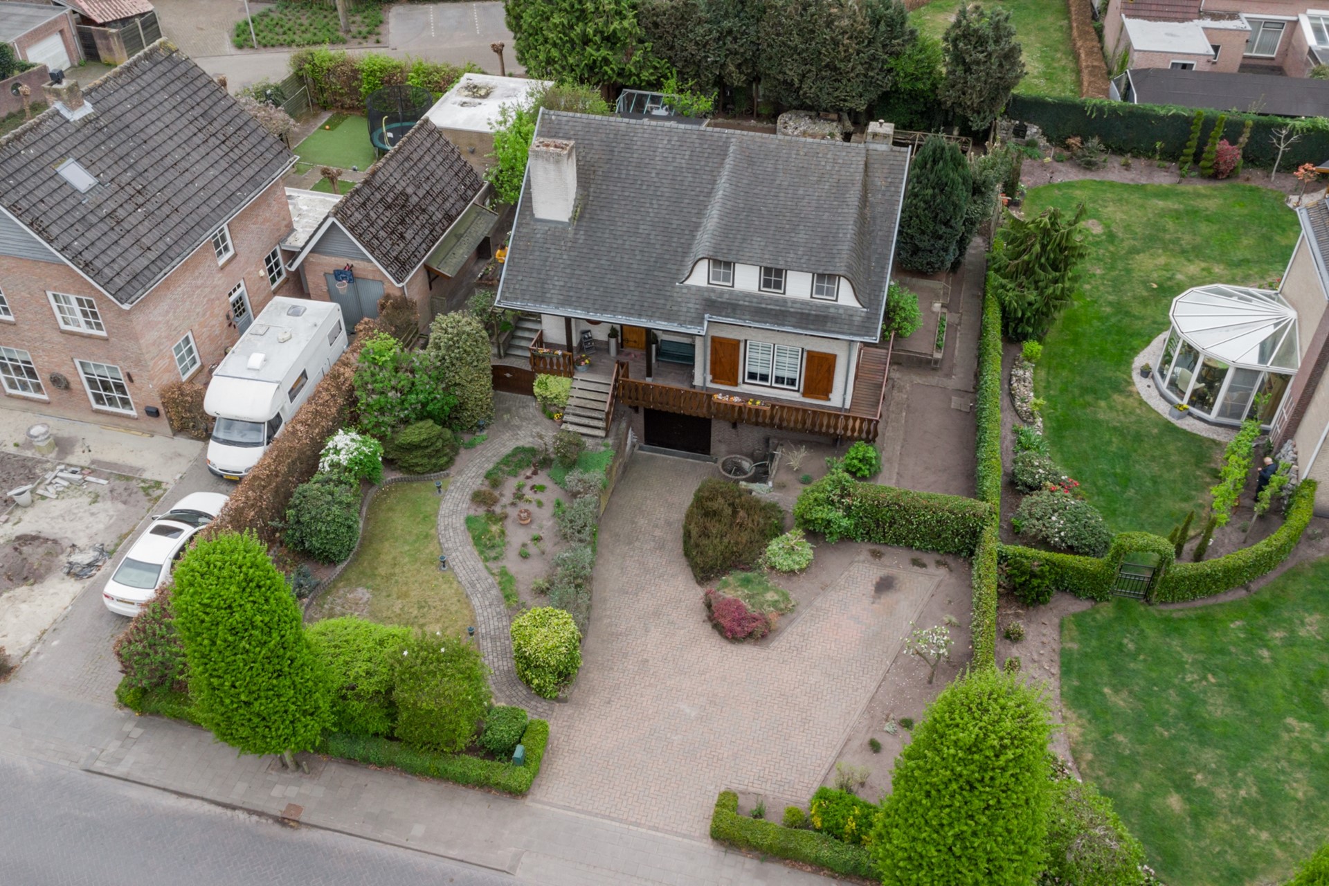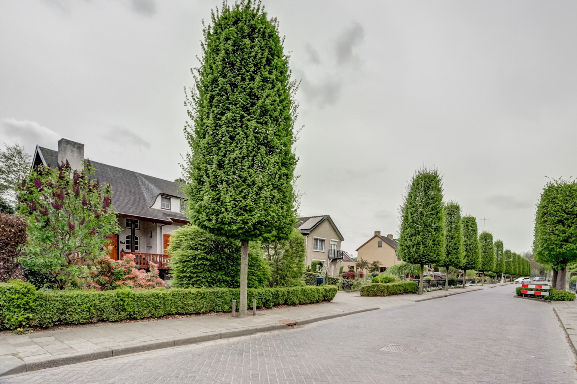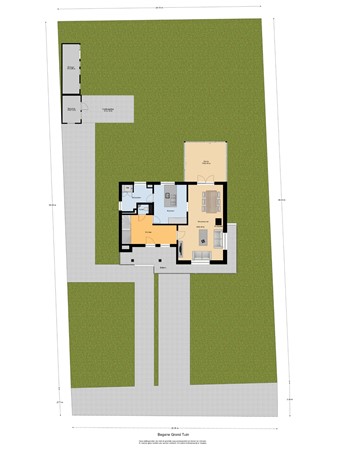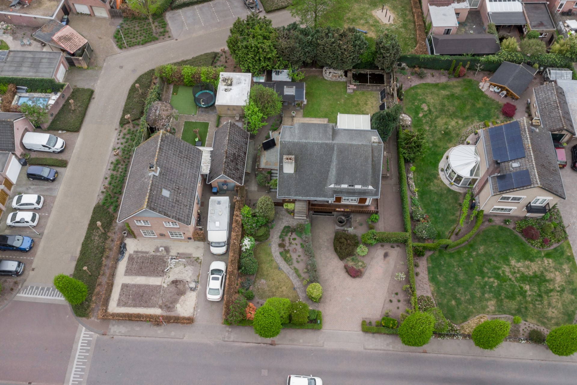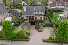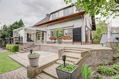 De woning heeft een ruime oprit aan de rechterzijde en een siertuin aan de linkerzijde. De tuin loopt aan de zijkanten van de woning door naar de achtertuin. De achtertuin is vanuit de woning te bereiken dmv de schuifpui in de serre of via de deur aan de zijkant van de woning. Je komt in beide gevallen eerst op het verhoogde terras dat op dezelfde hoogte ligt als de begane grond van de woning. Je kunt dan via verschillende trapjes naar de lager gelegen achtertuin.