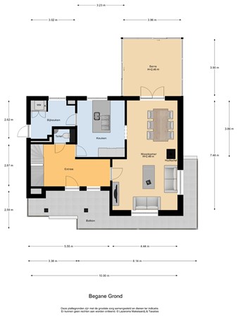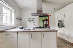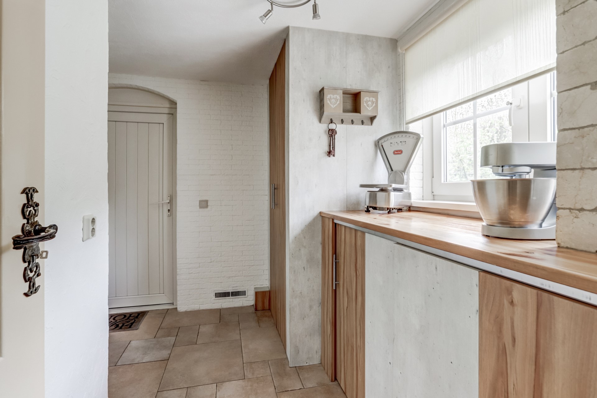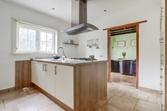 Vanuit de keuken is er toegang tot de bijkeuken. De bijkeuken heeft ook een werkblad met onderkasten en een hoge kast met daarin oa de omvormers van de zonnepanelen. De bijkeuken heeft geverfde wanden en een tegelvloer en via de bijkeuken kun je weer aan de zijkant van de woning naar buiten.