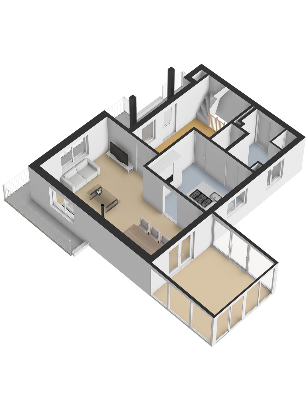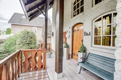 Als je de auto op de oprit hebt geparkeerd kun je aan de linkerzijde van de woning via een trapje naar het balkon en van daaruit naar de voordeur. Of je loopt via de poort naar de zijkant van de woning en gaat daar via een trapje omhoog naar de zijdeur die toegang geeft tot de bijkeuken.
