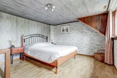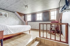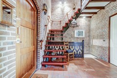 Vanuit de hal ga je een vaste trap naar de verdieping. Je kom dan op de overloop met een houten balustrade is afgescheiden van de vide en waar overheen je een mooi zicht hebt op de hal beneden. De overloop geeft toegang tot de 3 slaapkamers en de badkamer en heeft schoon metselwerk wanden en een houten schroten plafond/