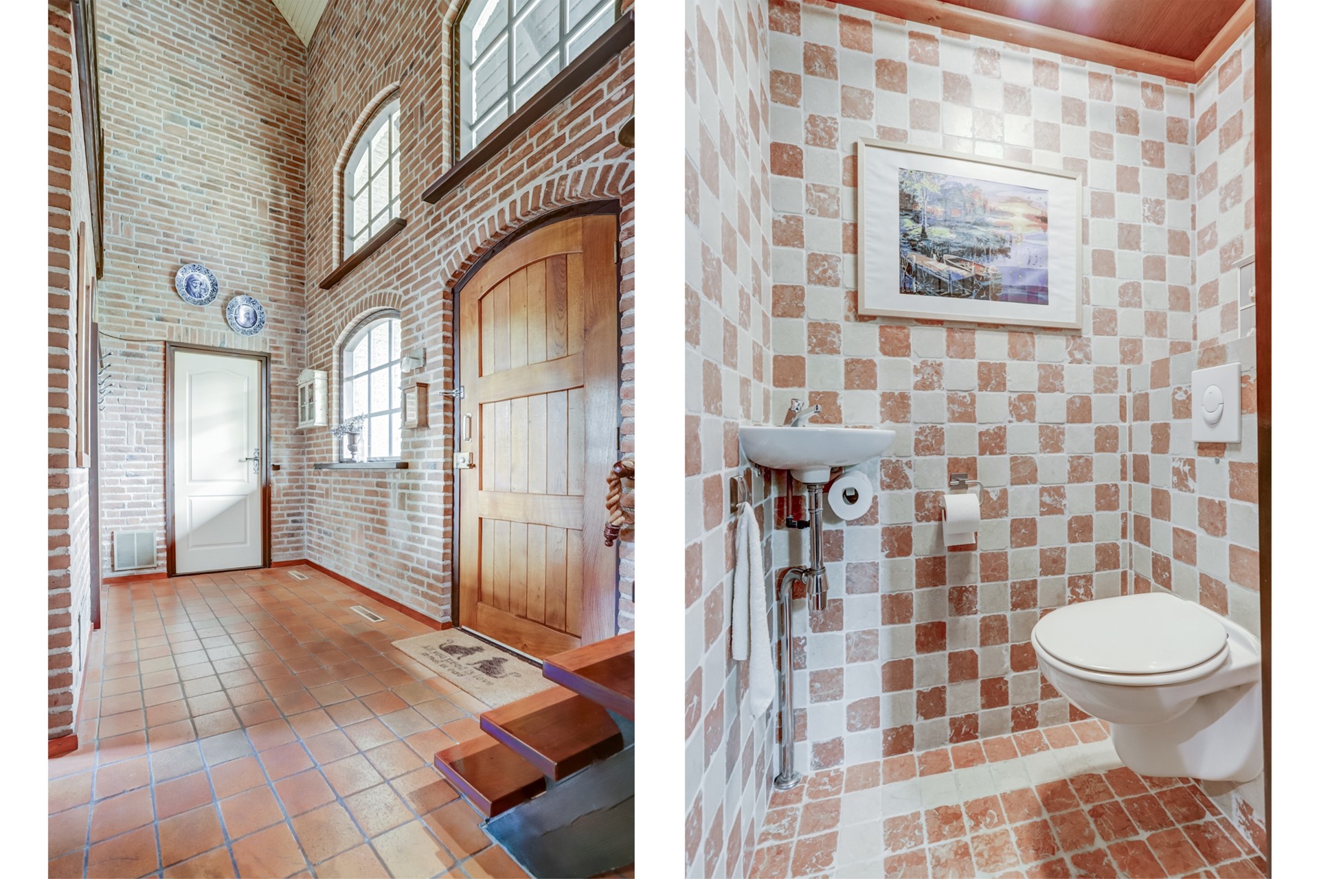 Via de voordeur kom je in de ruime hal met vide. De hal geeft weer toegang tot de toiletruimte, trapopgang naar de verdieping, de keuken en de woonkamer. De hal is voorzien van schoon metselwerk muren en plavuizen op de vloer en heeft een fraaie houten voordeur en houten kozijnen met enkel glas die wel voorzien zijn van voorzetramen.