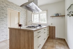 Vanuit de woonkamer en vanuit de hal heb je toegang tot de keuken. De keuken van ca 12m2 heeft een hoge kastenwand met daarin de koelkast, een heteluchtoven en diverse opbergkasten. Er is ook een groot schiereiland met een houten blad met kunststof toplaag met daarin verwerkt een 5 pits gaskookplaat en een een 1 !/4 spoelbak met mengkraan. 1 zijde van het eiland is voorzien van opberglades en de andere zijde is voorzien van een afwasmachine en opbergkasten.