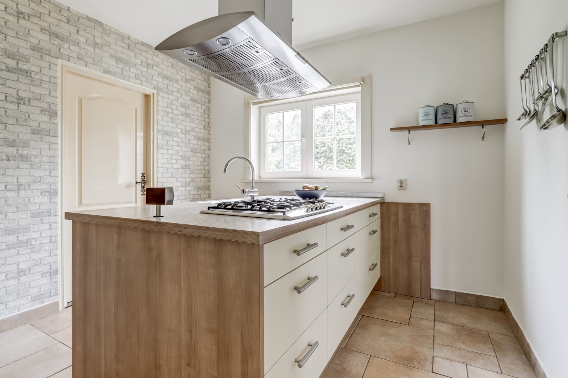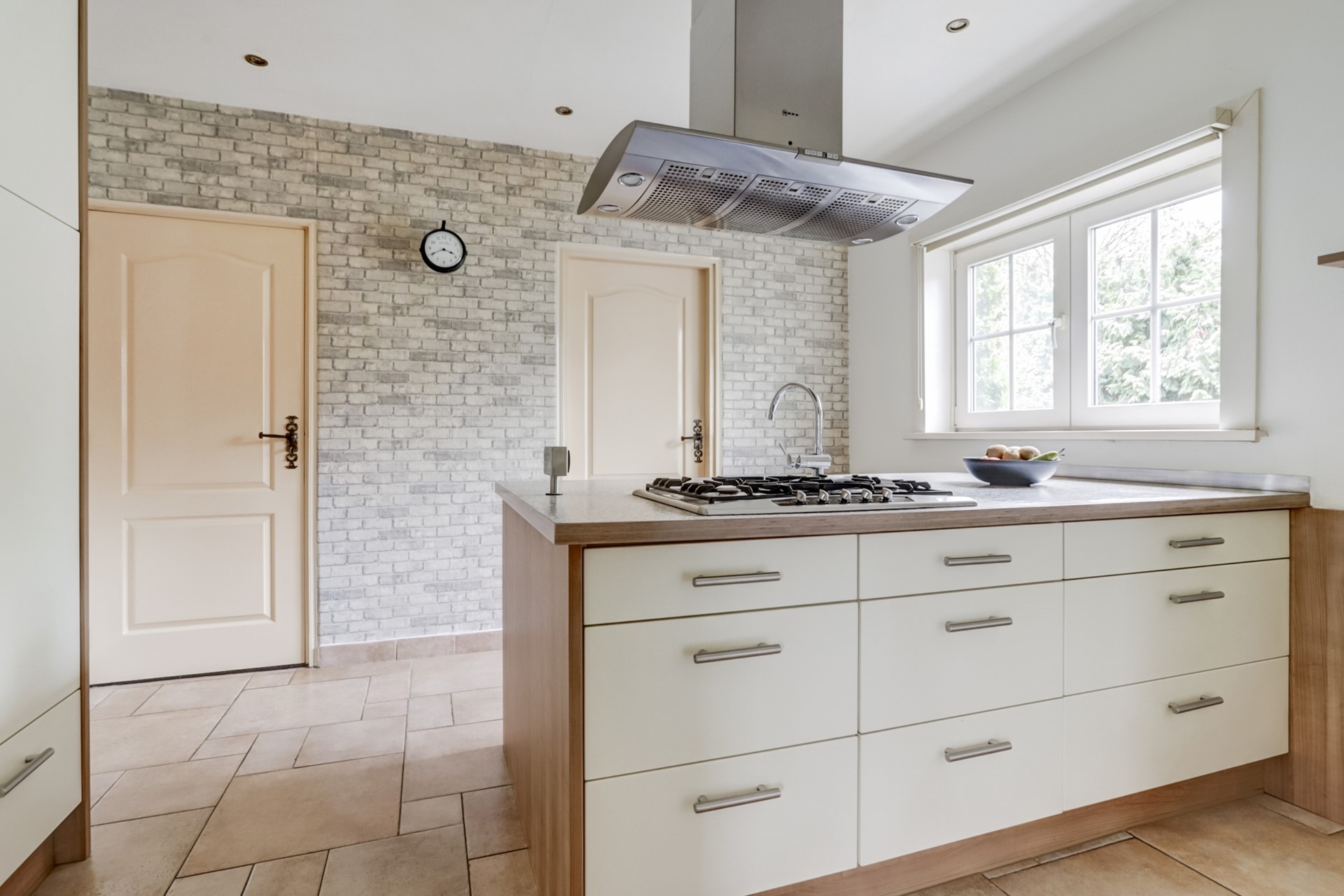 Boven het eiland hangt de afzuigkap die eventueel ook met een afstandsbediening is te bedienen.