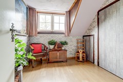 Slaapkamer 3: Deze slaapkamer van ca. 7,3m2 vloeroppervlakte is gelegen aan de achterzijde van de woning en is voorzien van een laminaatvloer, behang op de wanden en een gestukt en geverfd plafond. Verder heeft deze kamer nog een vaste ingebouwde kastenwand en een dakkapel met een kunststof kozijn en HR glas.