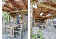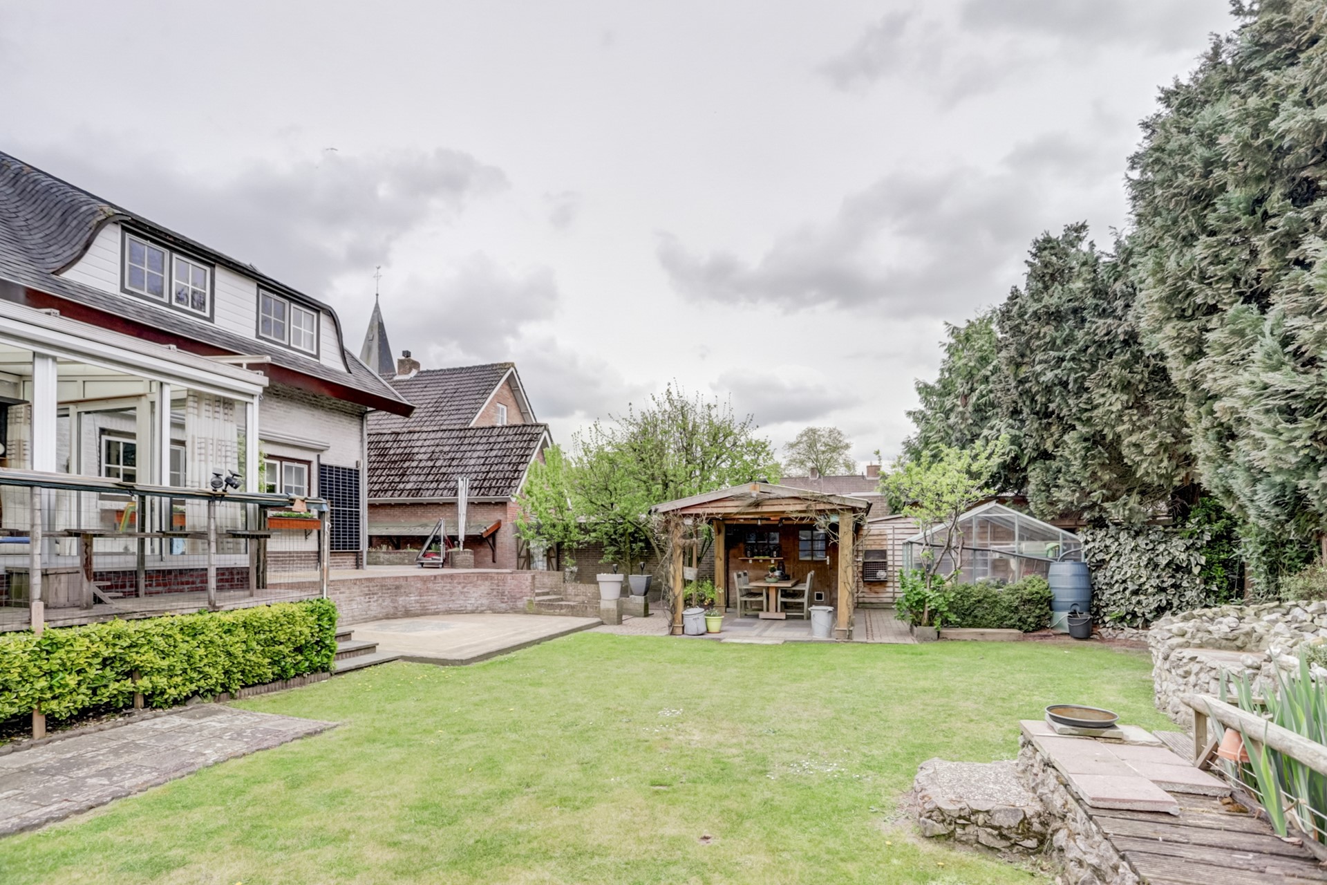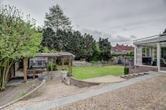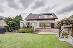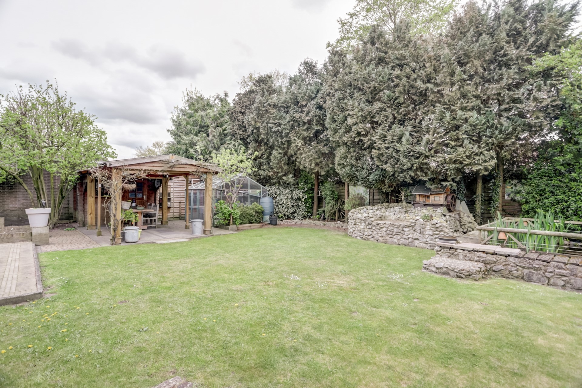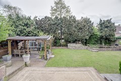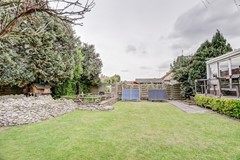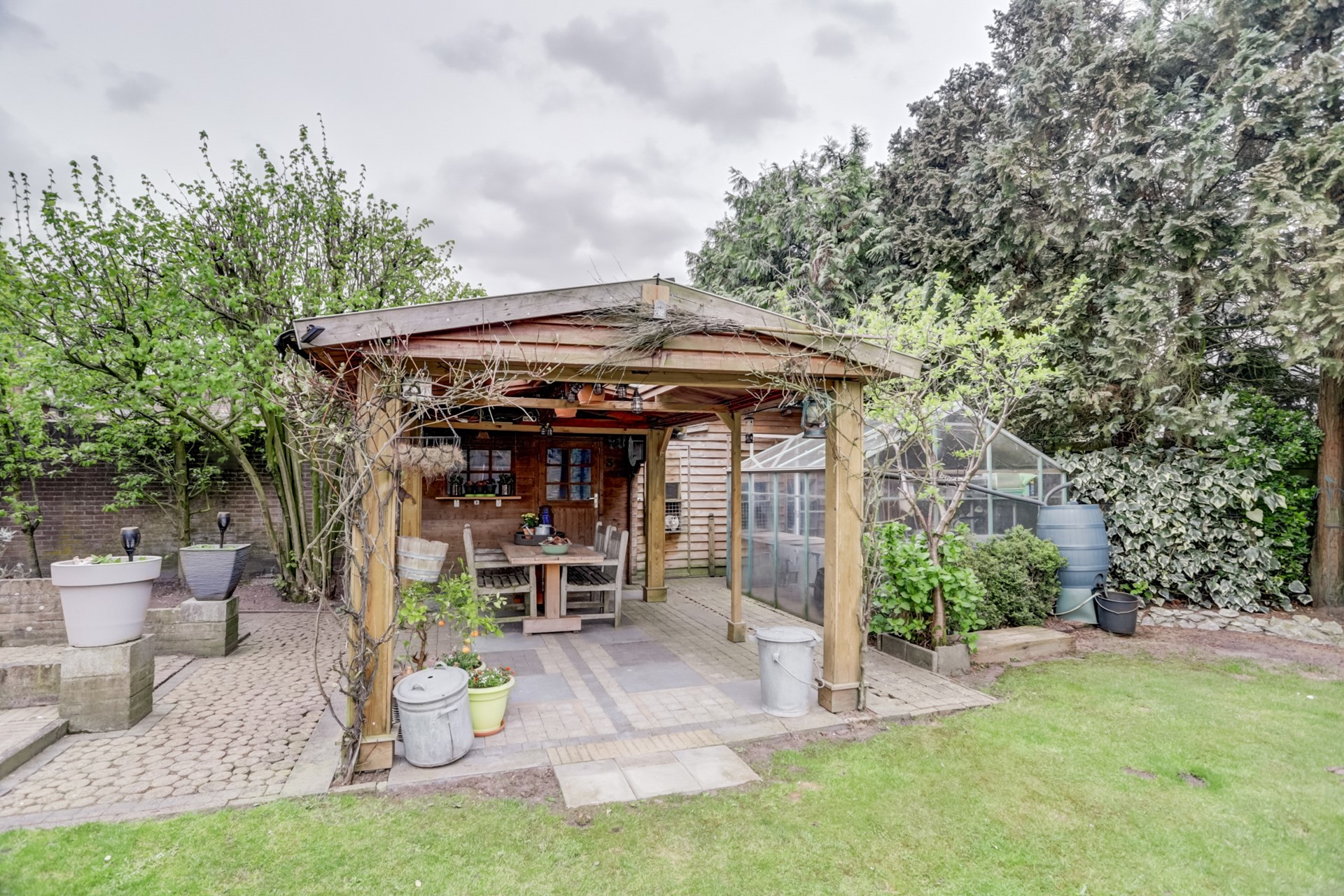 De achtertuin is keurig onderhouden en voorzien van een grasveld, volwassen plantenborders, een vijver met een waterval, een tuinkas en een houten tuinhuis/berging met daaraan vast een houten overkapping waar je in de zomer heerlijke uurtjes kunt doorbrengen.