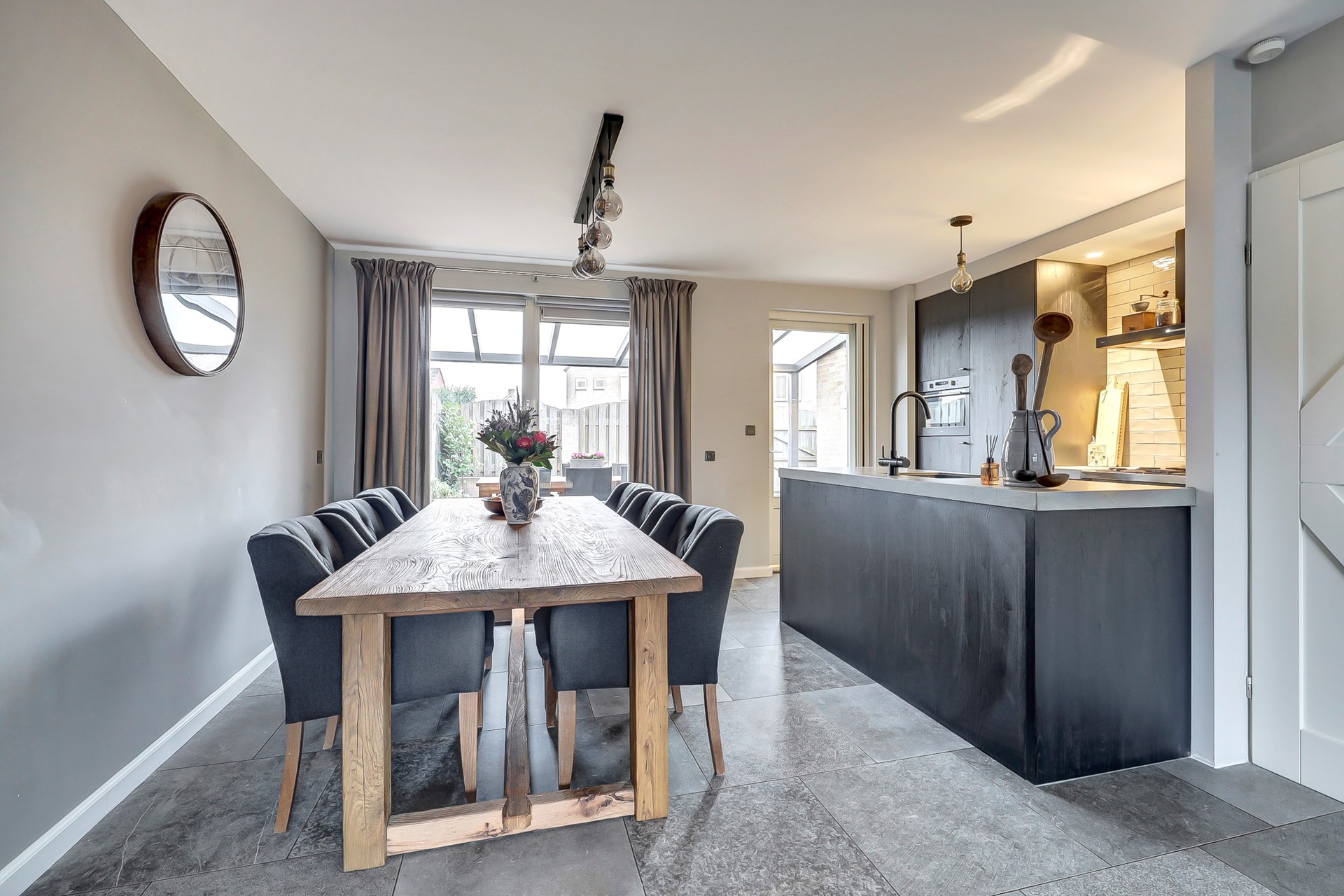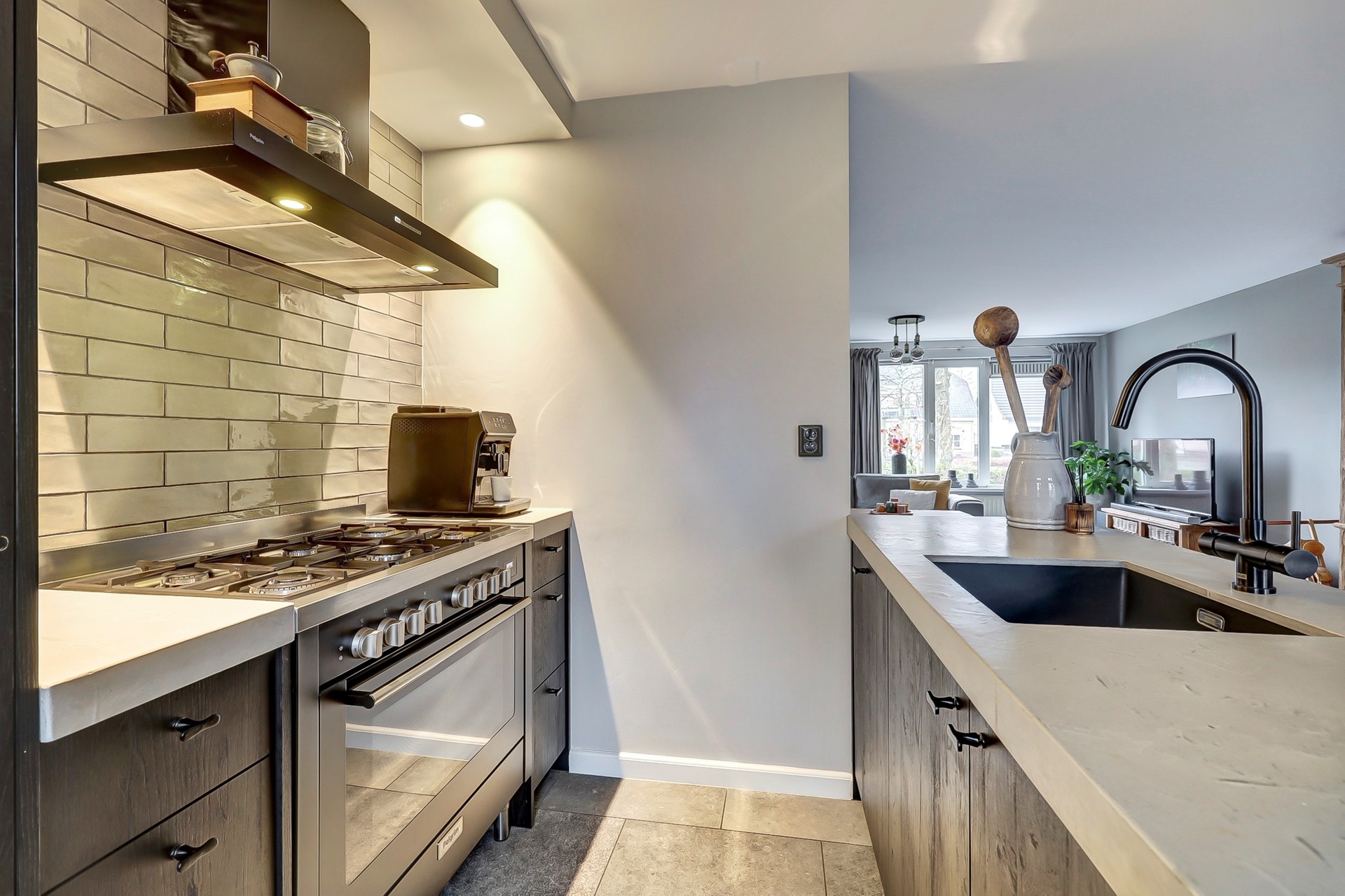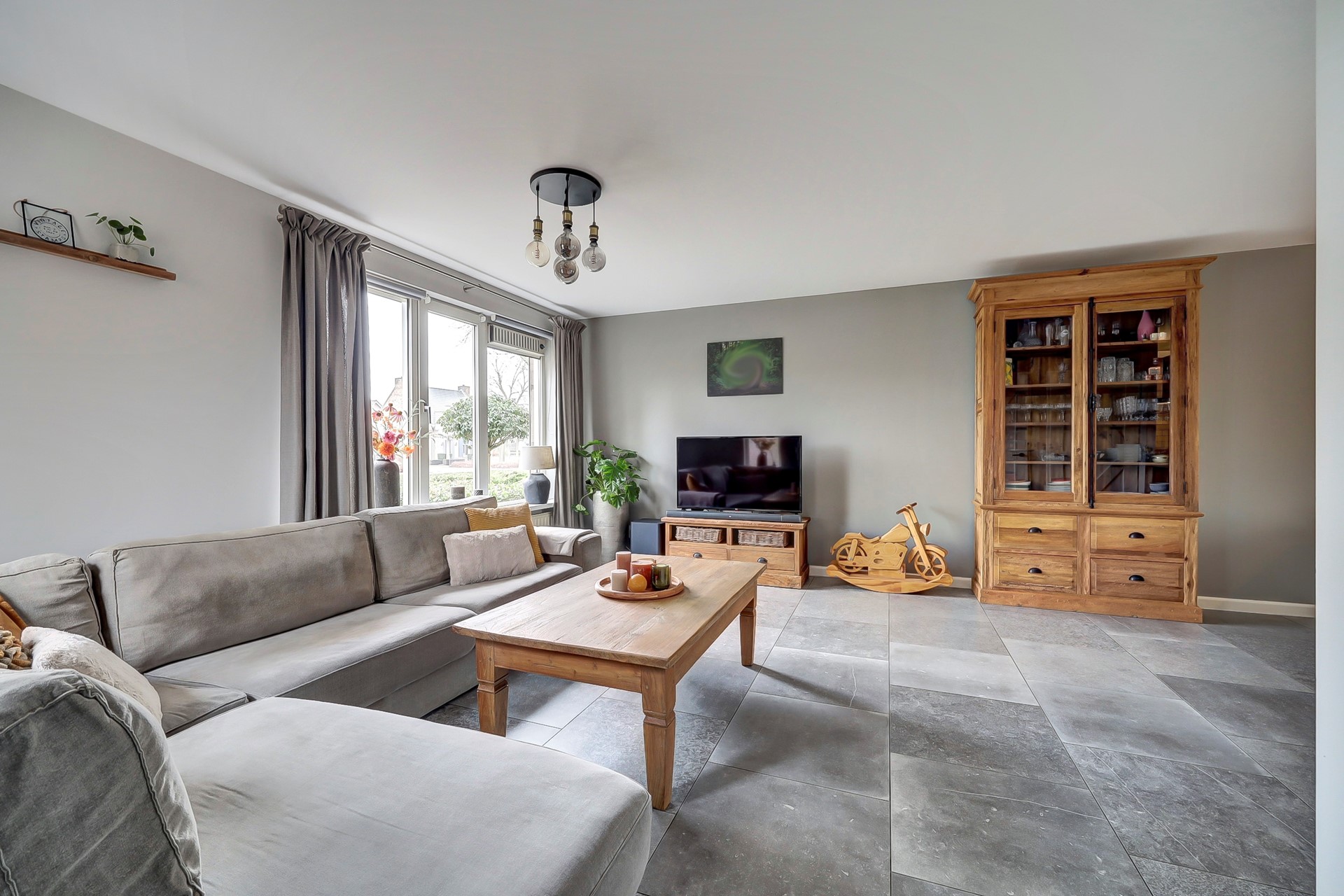 De woonkamer en de hal zijn voorzien van dezelfde tegelvloer (2021) zodat dit mooi één geheel is. De wanden en het plafond van de woonkamer zijn strak gestukt.
