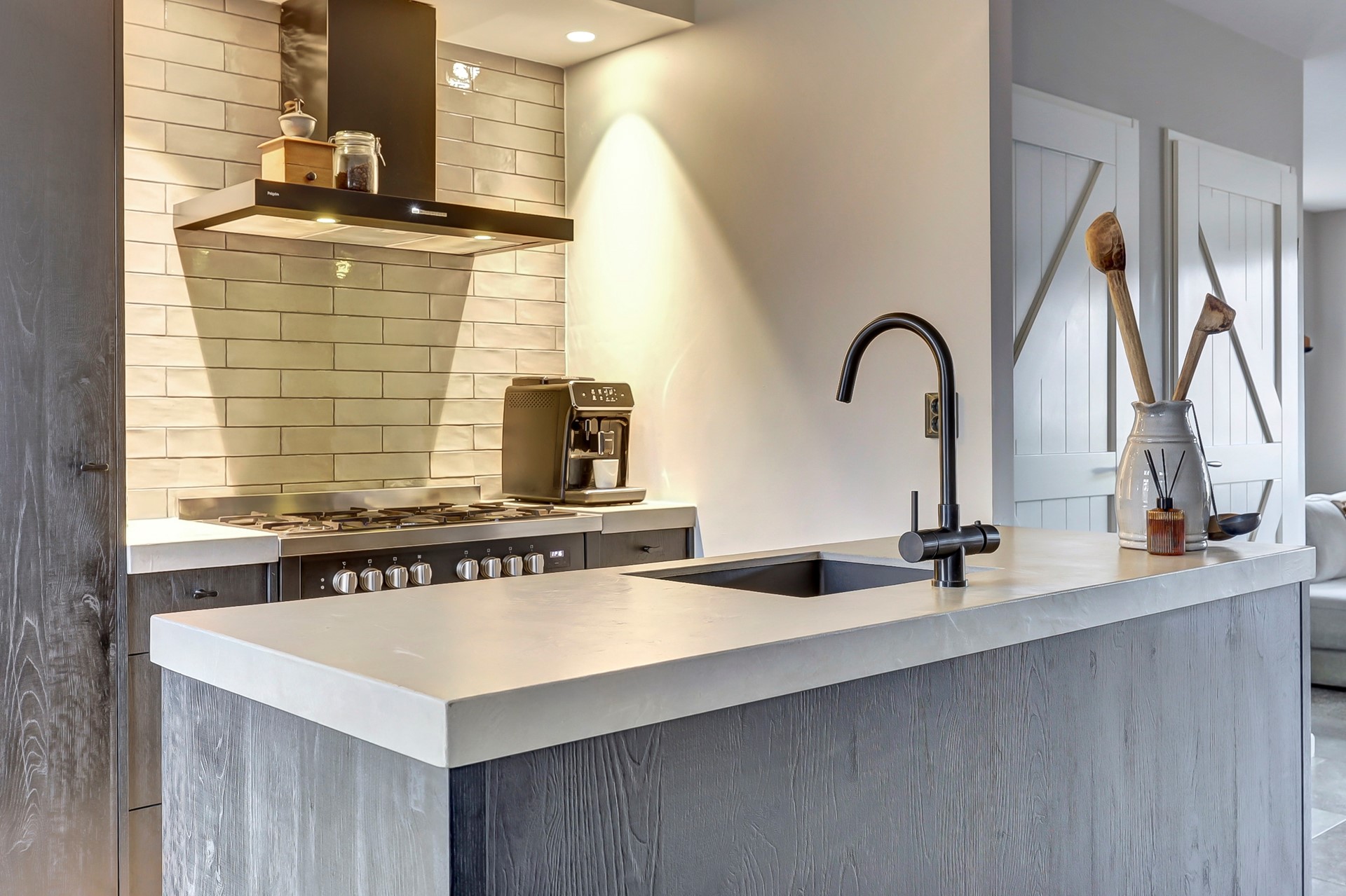 Op deze manier heb je tijdens het werk in de keuken toch nog fijn contact met je huisgenoten of met je gasten. De rechte opstelling tegen de wand is voorzien van 2 hoge kasten met daarin een combi magnetron en een koelkast en het lage gedeelte is voorzien van een werkblad van beton met in het midden een groot 6-pits fornuis met een grote pelgrim oven en er boven een vlakafzuigkap. Tegenover het rechte gedeelte staat het spoeleiland met een betonnen werkblad met in het midden een vierkante spoelbak met kokend water kraan en aan de onderzijde 2 opbergkasten en een vaatwasser.