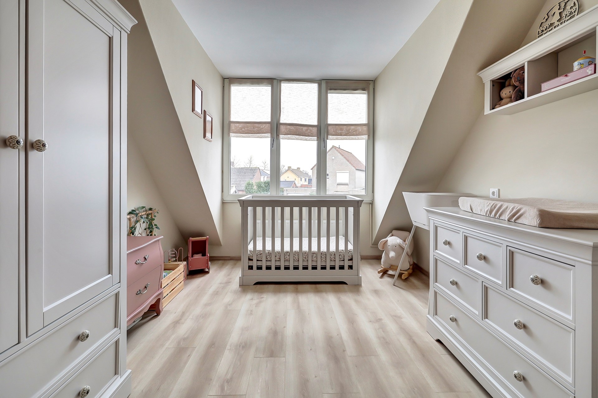 De 1e verdieping is aan de voor en achterzijde ook voorzien van rolluiken.