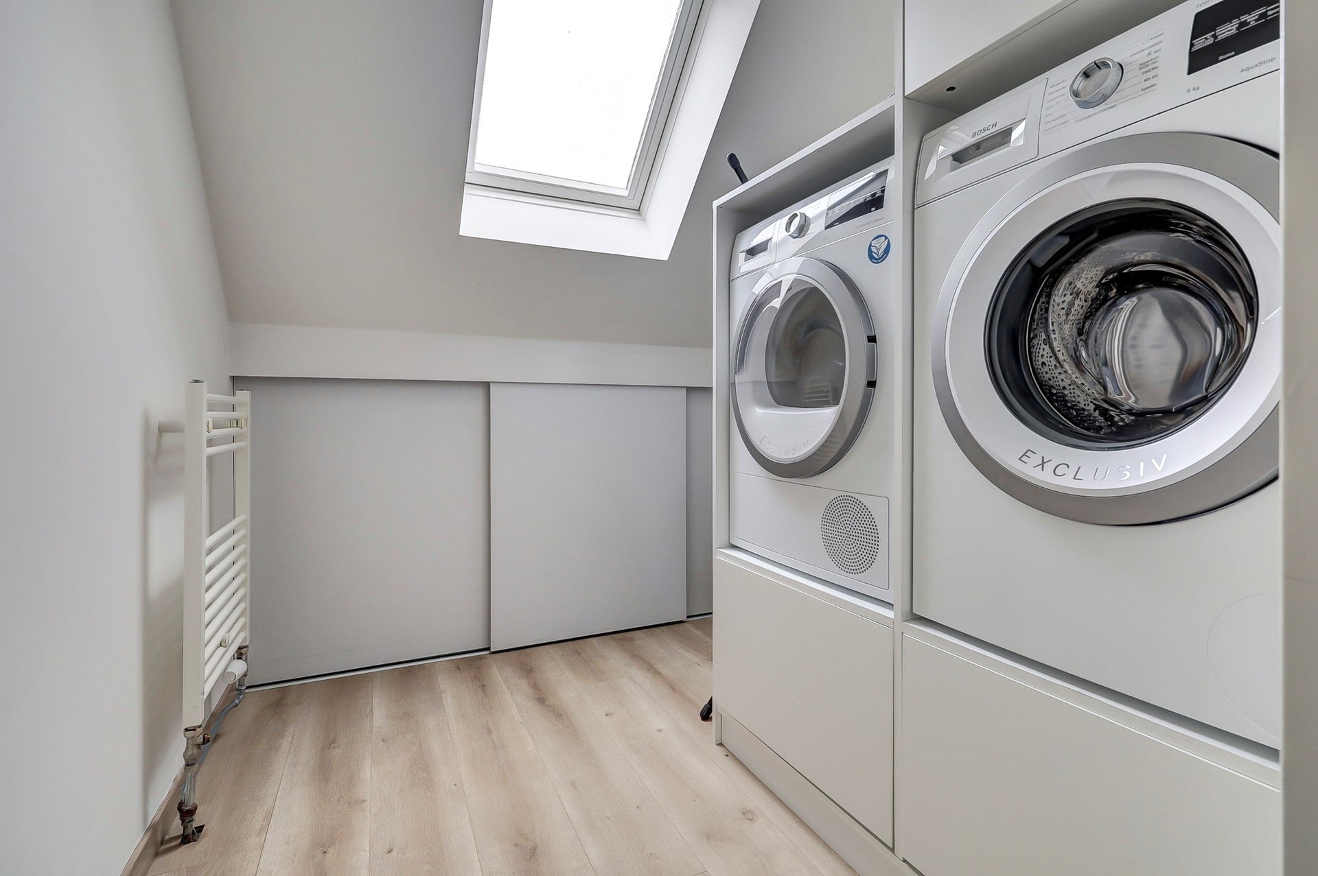 Wasruimte: Deze kamer van ca 4m2 was oorspronkelijk de badkamer en is nu omgevormd tot wasruimte(2024). De kamer is voorzien van een mooi opbergmeubel met daarin de wasmachine en de droger. Verder is deze ruimte voorzien van een laminaatvloer, strak gestukte wanden en plafond, een houten dakraam met dubbel glas en een radiator.