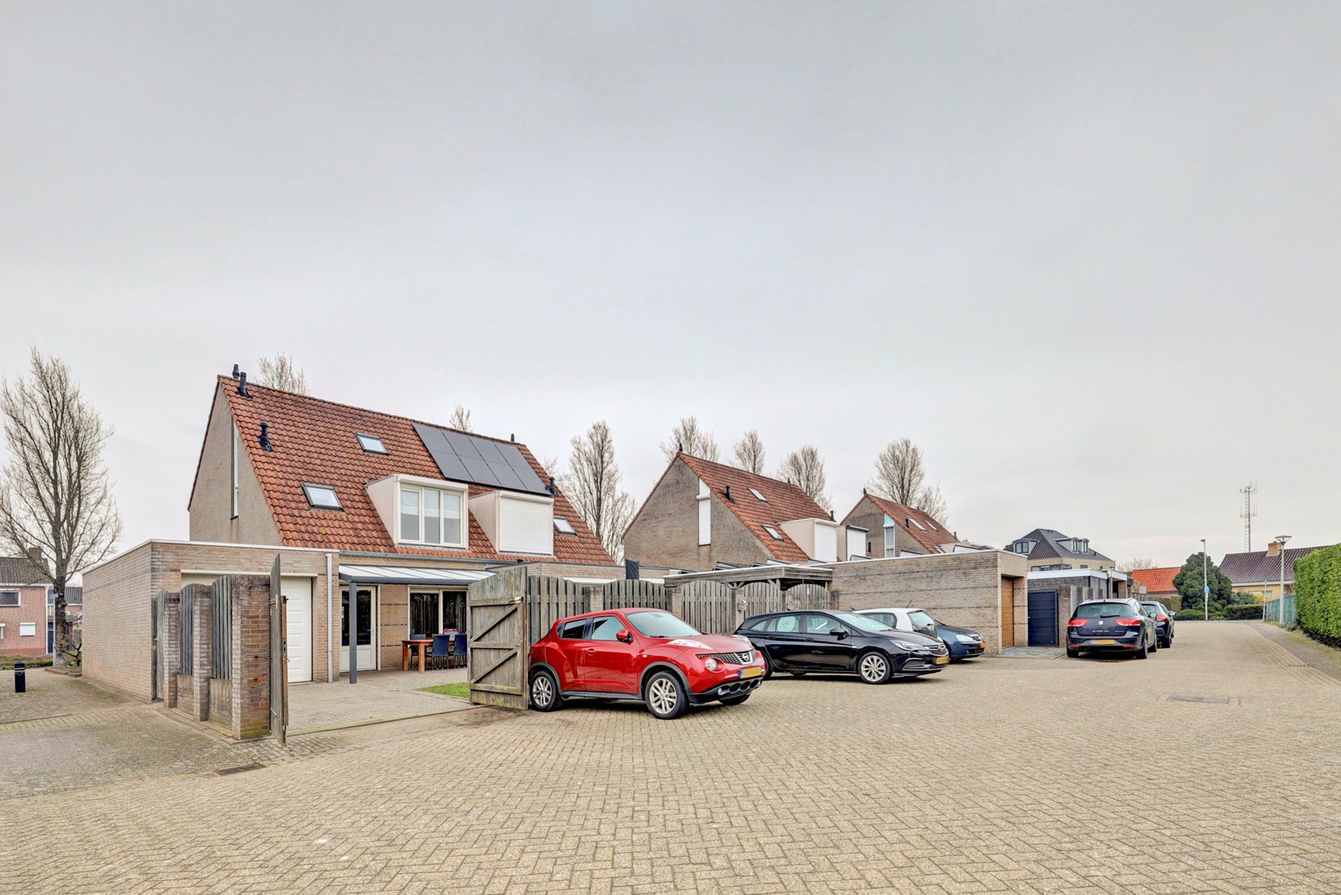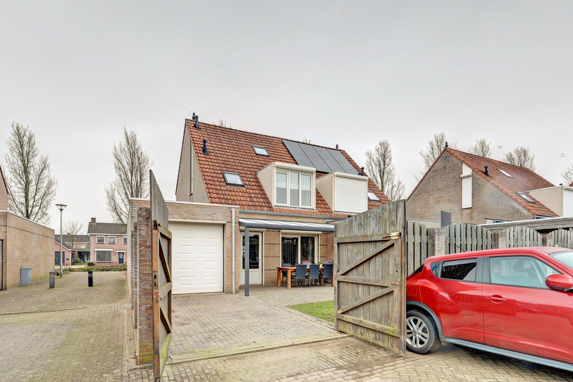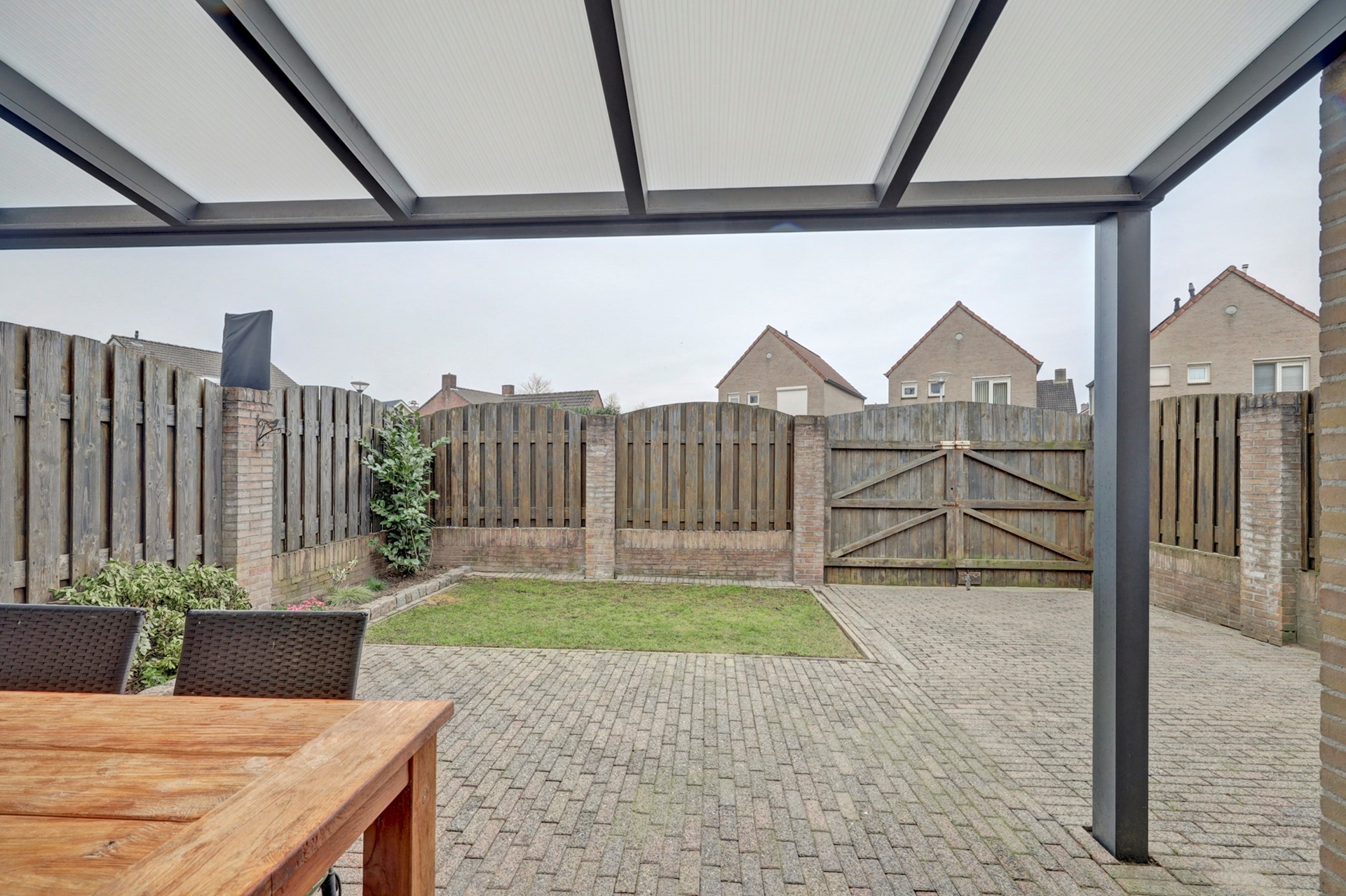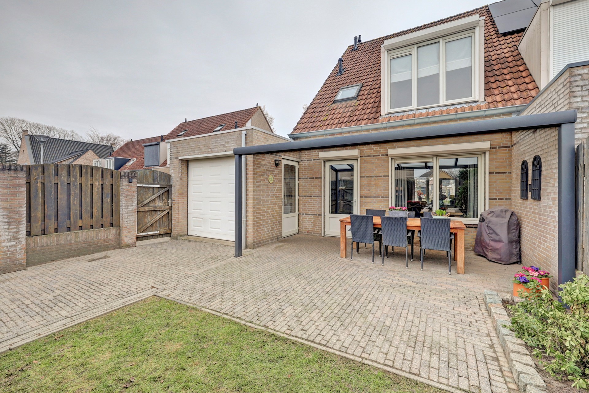 Via de openslaande deuren in de schutting aan de achterzijde kun je met je auto of motor zo de garage in rijden.